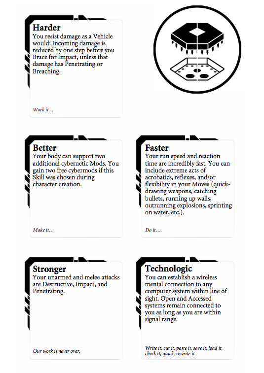 Mods are Class 1 Assets. Like all the Assets presented in Uncharted Worlds, Mods grant narrative tools to the characters (Uncharted Worlds core book, page 110). Unlike other Assets, Mods are relatively permanent and can’t be swapped out at a moment’s notice. On the other hand, they can’t easily be stolen or lost (without a lot of messy side-effects).