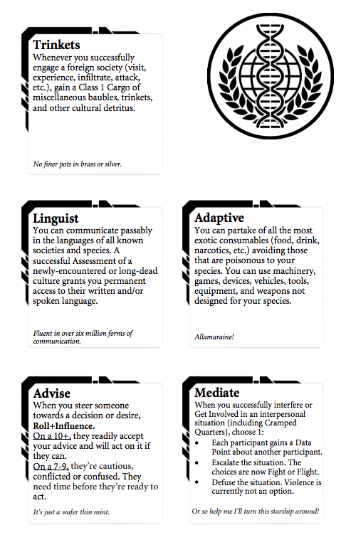 The chosen advancement should make narrative sense to the character and the current situation. Characters should avoid choosing advancements which would be nonsensical or impossible, such as trying to adopt a Primal lifestyle (Adapt) while on a space station.