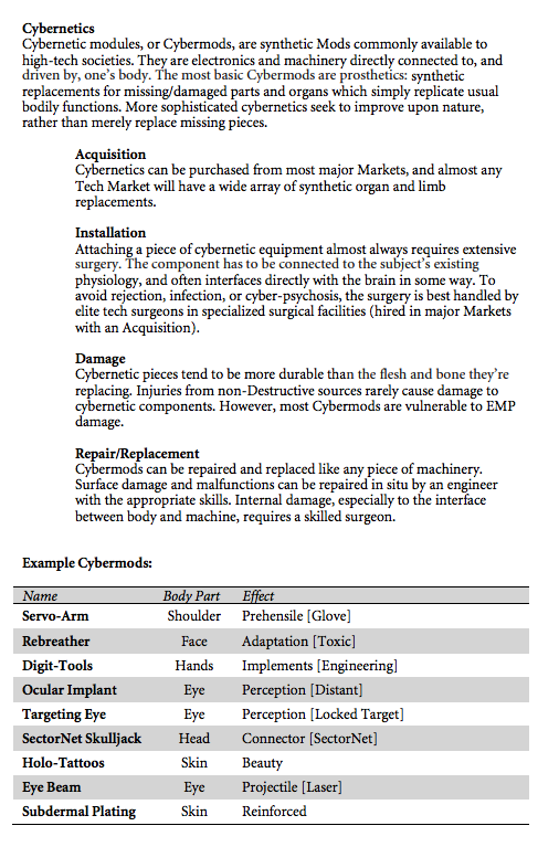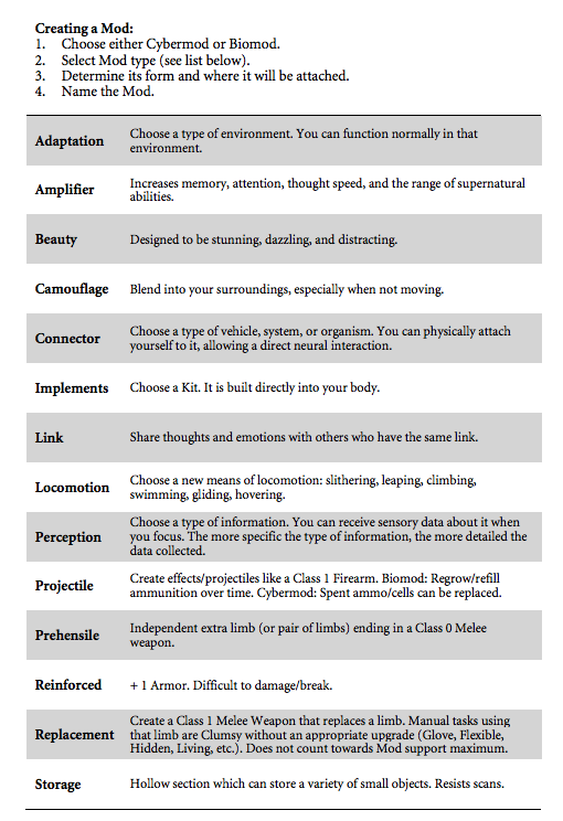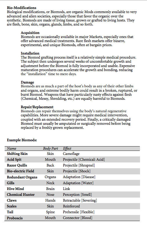 As technologies advance, many species find themselves stunted not by their tools, minds, or determination, but by their own physical limitations. Cybernetics and Bio-modification (Mods) are two fields of research that seek to artificially enhance the individual and break through those limitations. Each Mod is designed to enhance a certain aspect of the subject, such as senses, resilience, multitasking, beauty, and so forth.